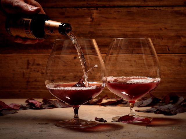2. Eiswürfel in ein zweites Glas geben, den Drink durch ein Barsieb über die Eiswürfel gießen. Mit einer hauchdünnen Scheibe Rote Bete oder einem zweiten Streifen Orangenschale verzieren.