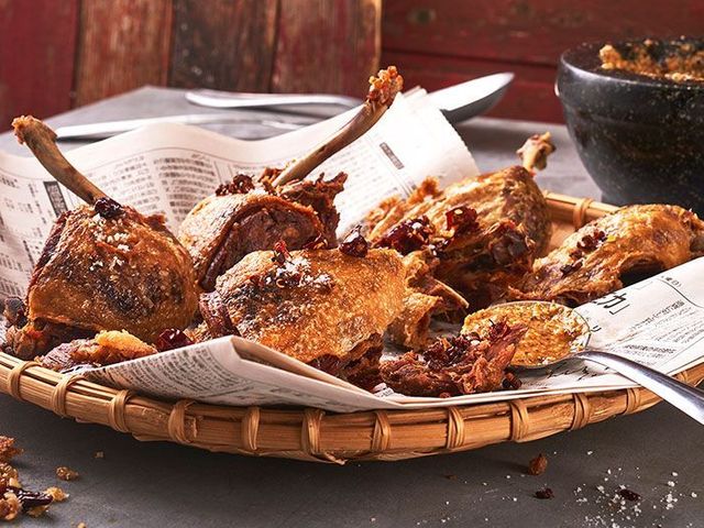 1. Die Ober- und Unterschenkel der Entenkeulen strecken, das Gelenk ertasten und mit einem Messer durchschneiden. Das Fleisch mit Meersalz und Zucker einreiben. Eng in eine Schüssel schichten, mit Folie zudecken und im Kühlschrank 24 Stunden ziehen lassen.