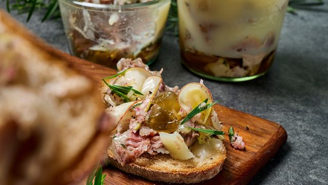 5. Das Brot in dünne Scheiben schneiden, evtl. rösten. Etwas Entenconfit auf den Broten verteilen. Jeweils einen Löffel Apfelsalat auf die Brotscheiben setzen. Mit frisch gemahlenem Pfeffer bestreuen.