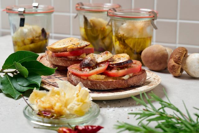 Anwendungsbeispiel: Die Zehen einer Knoblauchknolle aus den Schalen drücken, auf Röstbrote streichen und mit ein paar Scheiben Tomate und gebratenem Steinpilz belegen.