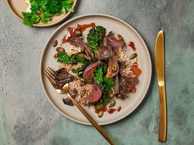 2. Die Pilze waschen, abtropfen und auf einem Küchentuch noch etwas besser trocknen. Schafgarbe waschen und trockenschleudern. Pfefferkörner von den Rispen lösen. Kalbsjus um die Hälfte einkochen – auch wirklich gute Jus aus dem Glas muss man in der Regel noch etwas mehr konzentrieren, die selbstgekochte Kartoffeljus dagegen nicht.