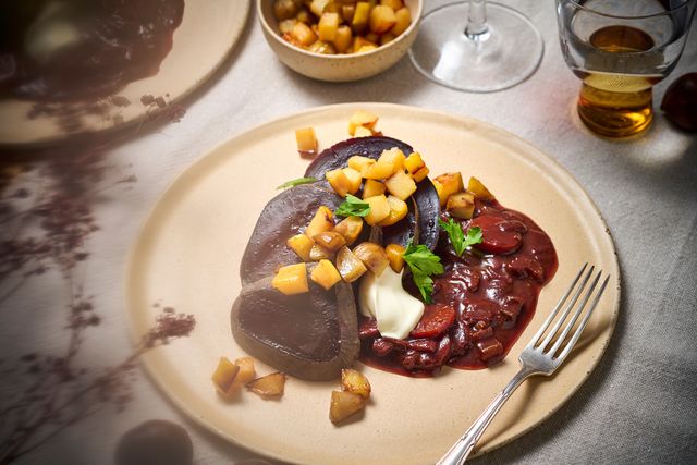Manche finden Rote Beten eher grob und bäuerlich. Das hat mit dem erdigen Duft der Knollen zu tun. Ich mag ihn (buddele auch gerne in der Erde) und ich mag die Knollen in jeder Form – ganz einfach im Ofengemüse oder in Salaten (einige Probier-doch-mal-Rezepte siehe unten). Sogar einen Cocktail mit Roten Beten habe ich schon gemixt – der ist auch fein, mit etwas mehr Blutorangensaft sollte »Red Betty« auch ohne Alkohol sehr gut schmecken. Bei meinem heutigen Rezept geht es mir jedoch vor allem um die Sauce, die setze ich ähnlich wie für einen Schmorbraten an. Mit Schalotten, reichlich Gemüse und Rotwein wird die Sauce tief und wuchtig, ideal für Comfort Food an kalten Tagen. Um die Einkaufsliste nicht unnötig zu verlängern, hatte ich die Beten einfach ganz ohne Schnickschnack in den Ofen gelegt. Das funktioniert gut, nach einer Stunde etwa sind sie weich und Sie können schöne Scheiben daraus schneiden. Beim nächsten Mal werde ich die Beten aber in einer Kastenform eng aneinander legen, mit Salz knapp bedecken und dann erst im Ofen garen. So verlieren sie noch mehr Feuchtigkeit, das ist kaum zusätzliche Arbeit und schmeckt noch besser. Um das Salz später weiterzuverwenden, im abkühlenden Ofen trocknen, abkühlen lassen, verkrümeln und wie gewohnt damit würzen – kann sein, dass es sich bei der Prozedur etwas rosa färbt.