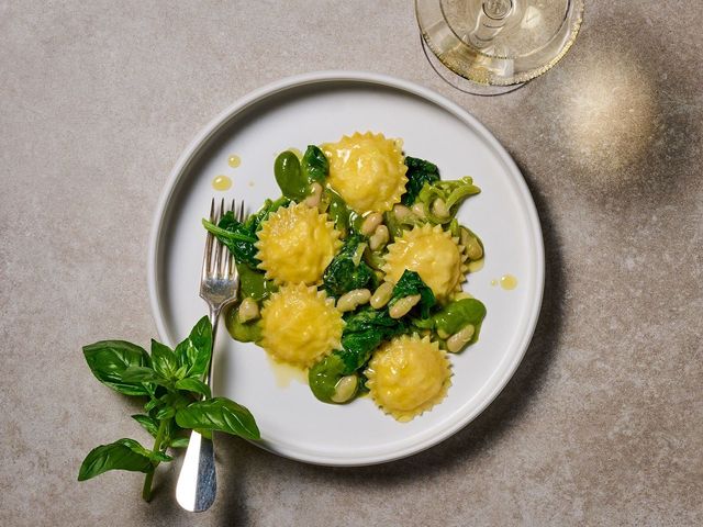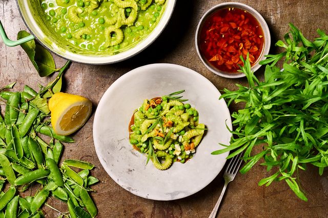 5. Pasta in Salzwasser bissfest kochen. Etwas Nudelwasser abschöpfen, restliche Erbsen damit bissfest dünsten, vom Herd nehmen, Zitronenwürfel untermischen. Spizzulus abgießen und abtropfen, dabei etwas Nudelwasser auffangen. Das Pesto im Nudeltopf mit 2 EL Nudelwasser verrühren, Spizzulus vorsichtig untermischen. Mit Zitronenerbsen, Chiliöl und Estragonblättchen anrichten.