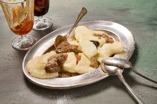 Weder süß noch salzig ist der Kartoffelteig für diese gemütlich herbstlichen Teigtaschen – aus den Resten vom Fotoshooting habe ich später Gnocchi gerollt. Doch mit der passenden Füllung und leicht süßen Nussbröseln wird aus dem neutralen Teig ein wunderbares Dessert. Die Füllung soll möglichst aromatisch sein, denn viel davon passt nicht hinein in so eine Tasche. Powidl, also österreichisches Zwetschgenmus, oder Marillenpowidl eignen sich bestens, aber auch ungewöhnliche Füllungen wie Schlehenmarmelade passen sehr gut. Kürzlich hatte ich eine Marmelade aus leicht salzig fermentierten Aprikosen gekocht – auch die macht sich bestens in den Teigtaschen.