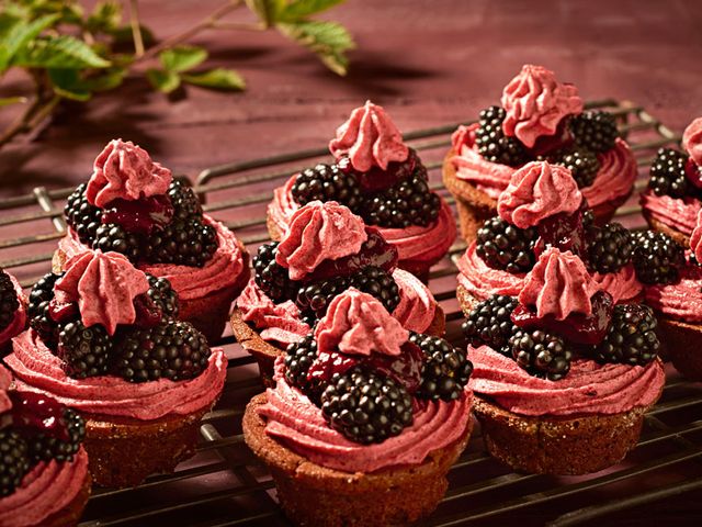 4. Beerencreme in die Teigschalen füllen, Brombeeren auf den Tartelettes verteilen, mit Verbeneblättchen garnieren.