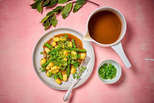 Kürzlich hatte ich ein paar Päckchen Tofu, die schon Monate über das Mindesthaltbarkeitsdatum hinaus im Kühlschrank herumdümpelten – es waren also Reste und es war Eiweiß, nämlich aus Hülsenfrüchten. Ich röstete also dünne Tofuscheiben statt Knochen und kochte eine Jus. Die schmeckt sehr gut, zum Beispiel, wie auf dem Foto, als Sauce für Gnocchi mit grünem Spargel. Eine sehr gute Resteverwertung. Aber geröstete Knochen geben mehr Geschmack ab, als gerösteter Tofu, man darf die beiden Saucen nicht vergleichen. Zum Schluss entdeckten wir noch eine geniale Verwendung für die Reste der Reste, nämlich die gerösteten und ausgekochten Tofuscheiben. Mehr dazu nächste Woche.