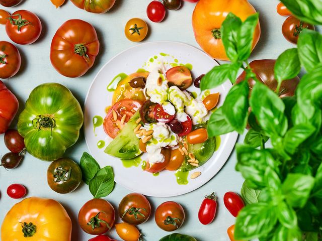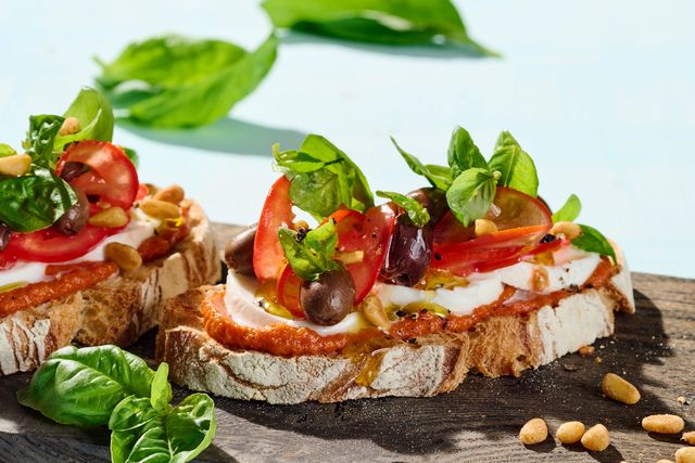 3. Restliche Tomaten und den Mozzarella in dünne Scheiben schneiden. Basilikum zupfen, mit ein paar Tropfen Zitronensaft, Salz und Pfeffer marinieren. Weißbrot in Scheiben schneiden, die Scheiben halbieren und toasten oder im Paninigrill rösten. Mit Tomatenaufstrich bestreichen, mit Mozzarella und Tomatenscheiben belegen, Basilikum, Oliven und Pinienkerne wie einen Salat auf die Tomaten häufen, mit Olivenöl beträufeln.