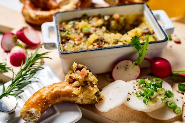 Das Fett in meinem veganen Griebenschmalz ist nirgendwo herausgeschmolzen, eigentlich ist es wahrscheinlich nur eine knusprige Gewürz-Margarine. Doch Apfel, Kräuter und geröstete Zwiebeln bilden eine Aromawelt, die mich stark an ein sehr gutes Schmalz erinnert. Und die kleinen knusprigen Tofuwürfel funktionieren ganz prächtig wie Grieben, also knusprig ausgelassene Hautstückchen im bayerischen Griebenschmalz. Mein Kollege Nils und ich haben das Rezept entdeckt, weil wir ausgekochten Tofu aus unseren Tofu-Jus-Experimenten nicht wegwerfen wollten – diese Verwertung der Reste von der Resteverwertung hat uns dann begeistert. Nennen Sie ihn wie sie wollen, aber probieren Sie diesen geschmeidig-knusprig-aromatischen Brotzeitbegleiter unbedingt aus!