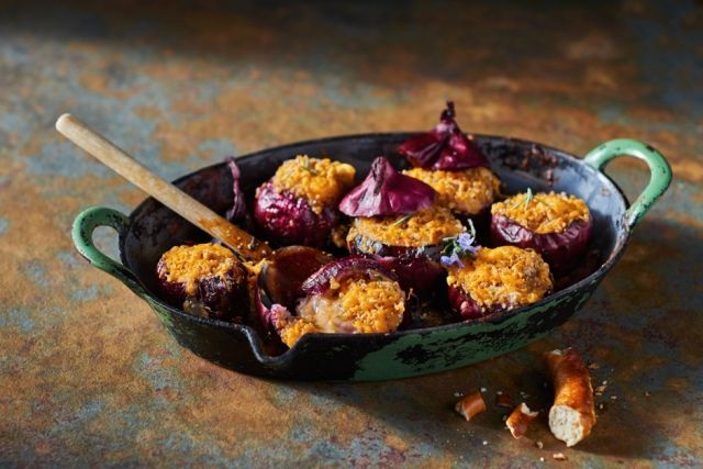 3. Zwiebeln aus dem Ofen nehmen, ein paar Minuten abkühlen lassen. Mit einer Schere von den Zwiebeln einen Deckel abschneiden, Zwiebeln vorsichtig mit einem Löffel aushöhlen, die äußeren beiden Schichten stehen lassen. Zwiebelschalen von den Deckelstücken abziehen. Das Zwiebelfruchtfleisch hacken, mit der Béchamelsauce und zwei Dritteln vom Käse vermischen, die Masse in die Zwiebeln füllen, restlichen Käse mit Brezenbröseln mischen und über die Zwiebeln streuen. Mit Olivenöl beträufeln und im Ofen noch etwa 10 Minuten goldbraun überbacken. Als Gemüsegericht mit einem Salat servieren, oder als Beilage mit Schmorgerichten kombinieren.