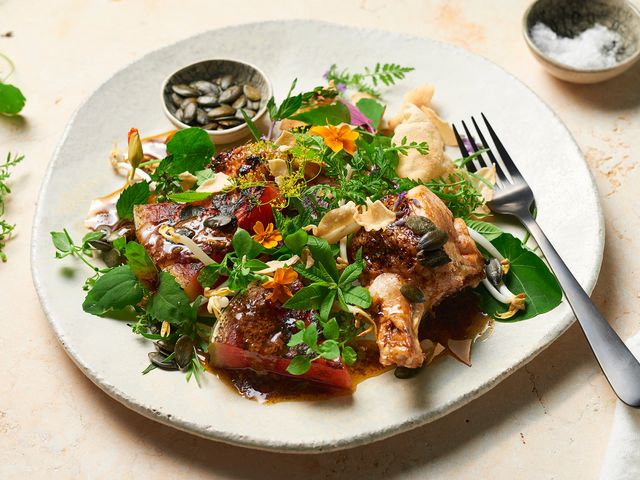 Sieht aus wie Rindfleisch, fühlt sich an wie Rindfleisch, schmeckt – wie eine höhere Form von Wassermelone. Und um die handelt es sich auch. Das Wassermelonen-Carpaccio ist ein kulinarisches trompe l’oeil, eine Illusion. Wenn man dicke Melonenscheiben lange bei schwacher Hitze trocknet, verdunstet sehr viel Wasser. Alle Aromen konzentrieren sich in der Frucht und es entwickelt sich eine besondere Konsistenz: Die Melone wird gleichzeitig ganz weich, bekommt aber durch die Verdichtung trotzdem mehr Biss als die rohe Melone.