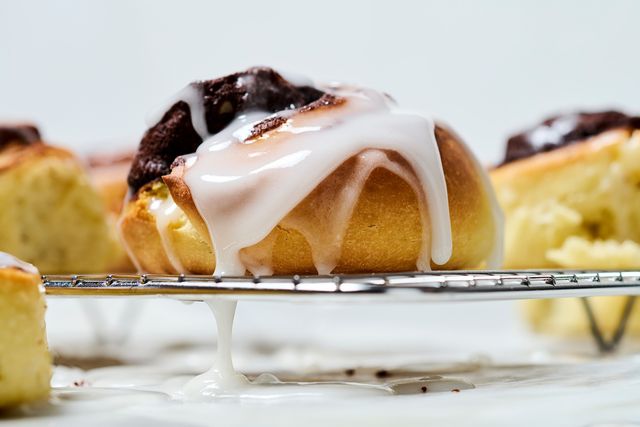 5. Zimtschnecken auf ein Gitter legen. Puderzucker und Zitronensaft verrühren und über die warmen Zimtschnecken verteilen.