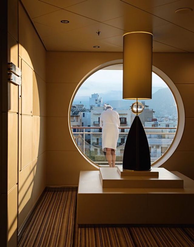 Verschwenderisch ist an Bord der MS Europa 2 auch die Ausstattung: In jeder Suite gibt es WLAN und sicher hundert Kinofilme im Bordprogramm, die über den Flachbildschirm abgerufen werden können. In der vier große Regale umfassenden Bibliothek stehen Kind 44 und Harry Potter, ungelesen. Die Computer vor den Regalen sind selten besetzt, deutsch-, französisch- und englischsprachige Zeitschriften und Tageszeitungen (im Online-Ausdruck) liegen ungelesen neben gänzlich neuen Schach- und Backgammon-Brettern. Gleich nebenan findet man ein Bordkino, einen Golfabschlagssimulator, die Sauna und den Fitnessraum samt Trainerin auf dem fünften Deck; auf dem zehnten eine Galerie mit wechselnden Ausstellungen, in der man die ausgestellten Fotografien und Grafiken auch kaufen kann. Nicht zu vergessen die 450 verschiedenen Weine an Bord. Dabei liegen die Leute vor allem in der Sonne und schauen aufs Wasser. Wie auf jedem Schiff.