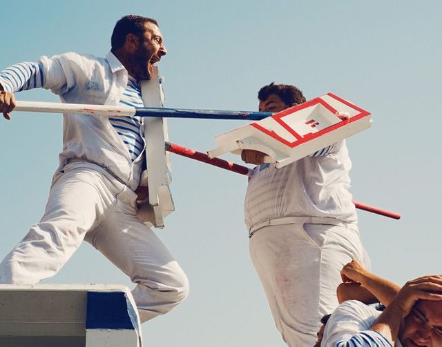 Wenn man sich die Bilder anschaut, die der Fotograf Christopher Anderson vom Finale der Fischerstecher gemacht hat, könnte man meinen, dass es bei dem Wettkampf auch heute noch um mehr geht als um Applaus und eingravierte Namen. In den Blicken der Lanzenstecher erkennt man diese Konzentration, die nur bei archaischem Kräftemessen zu beobachten ist: Elfmeterschützen schauen so. Stierkämpfer. Ringer. Und die Verlierer fallen so dramatisch ins Wasser und schlagen sich die Hände vors Gesicht, als würde beim Fischerstechen auch heute noch bestimmt, wer in der Stadt etwas zu sagen hat.
