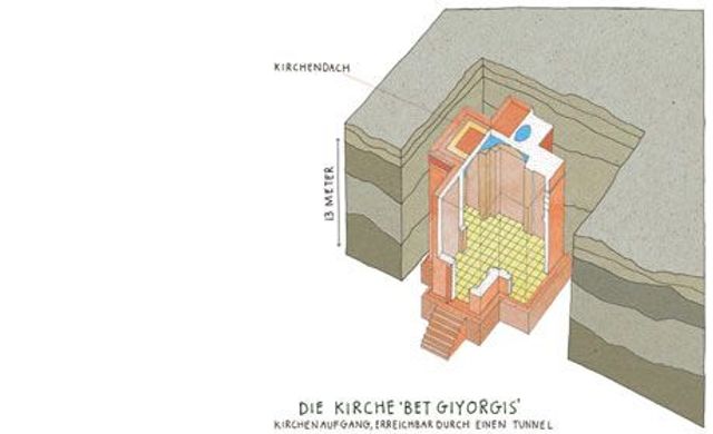 Ort »Ich kann einfach nicht aufhören zu fotografieren!« jammert eine Amerikanerin, überwältigt von der Schönheit dieses Ortes: elf Kirchen im nordäthiopischen Lalibela, von der Erdoberfläche bis zu zwanzig Meter in die Tiefe gehauen, 800 Jahre alt. Unterirdische Tunnel, die die Kirchen miteinander verbinden. Die Erde ist rot, der Wind streichelt warm, die Priester sind in weißes Leinen gehüllt und sehen so mystisch aus, als ob jemand sie für ein Fotoshooting platziert hätte. Überall: Rosenblätter, Weihrauch, Gesang, Trommeln, Pilger. Und Symbole, verschlüsselte Hinweise: drei Säulen hier, Sinnbild für die Dreifaltigkeit; zwölf Säulen dort, Erinnerung an die zwölf Apostel. Die kleinen Räume, in denen heilige Kirchenutensilien aufgehoben werden, heißen »Bethlehem«, der künstlich geschaffene Fluss, der das Wasser aus den Gebäuden leitet, »Jordan«. Manche Tunnel oder Gänge haben Namen wie »Hölle« oder »Himmel«. Eine Säule ist mit Stoff eingehüllt, auf ihr soll das Ende der Welt verzeichnet sein, keiner darf sie sehen. Alles ist Glaube hier, christlich-orthodox.