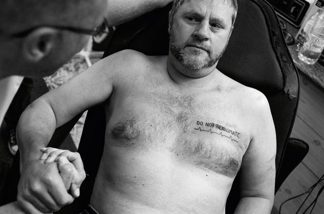 Michael Oschitzki, der Mann mit dem Schlaganfall, wachte eines Morgens auf, schweißgebadet: »Was, wenn der Arzt meine Patientenverfügung nicht liest?« Deshalb liegt er jetzt auf dem Stuhl von André, einem holländischen Tätowierer in Can Picafort. Er wünscht sich einen Schriftzug, klar, keine verspielten Schnörkel. Auf der linken Brust. »Mein Körper ist ein Gefängnis«, sagt er. Seine erste Idee für das Motiv war: ein Sarg, darunter »Escape from Azkaban«. Fliehen will Oschitzki. Aus einem Leben hinter Gittern.