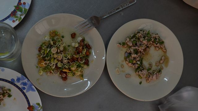 Mein kulinarischer Höhepunkt an diesem Vormittag ist ein Lokal mit vier Tischen, in dem wir zuvor Lemongras-Salat mit Erdnüssen und Salat mit Schweinefleisch, Zwiebeln und Thai-Dill probierten. Scharf, großartig, hab ich nie zuvor gegessen.