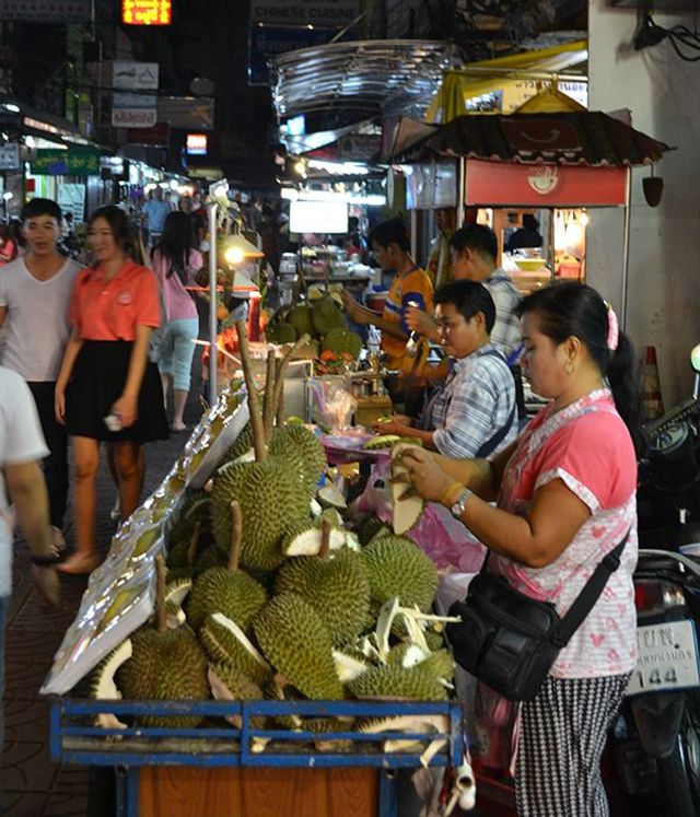 Hinter dem großen Tempel darf ich eine Durian probieren, eine Frucht, die aussieht wie eine Riesenlitschi mit Geschwüren. Thailänder lieben ihren Geschmack, aber man darf sie weder in Hotels mitbringen noch im Taxi, Bus oder auf den Booten transportieren, weil sie selbst ungeschält in der Plastiktüte noch entsetzlich riechen. Überall in Thailand sieht man die Verbotsschilder. Meine Zunge brennt immer noch von der Suppe, ich schmecke und rieche nichts von der Stinkfrucht.