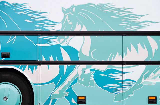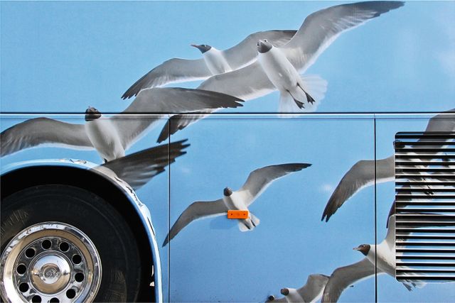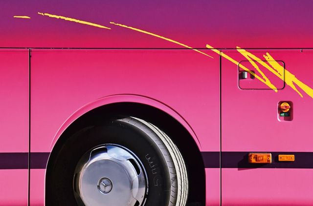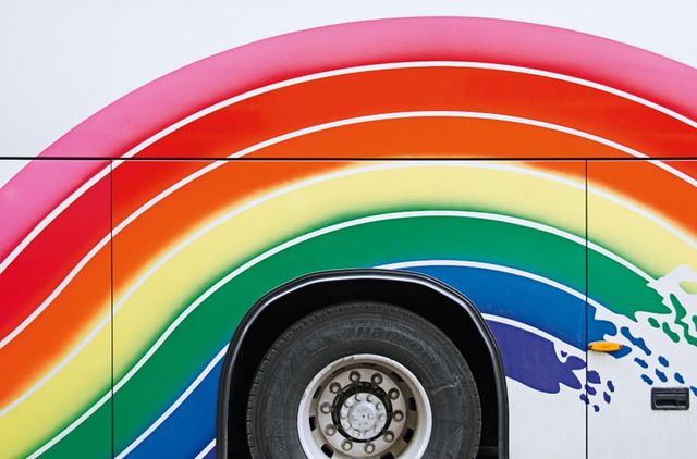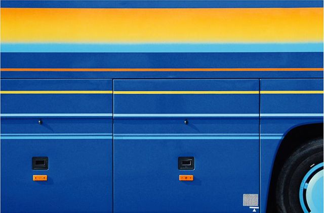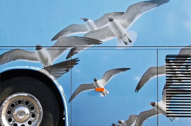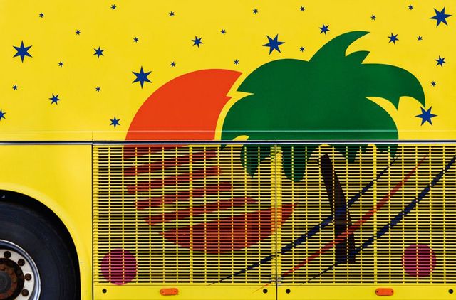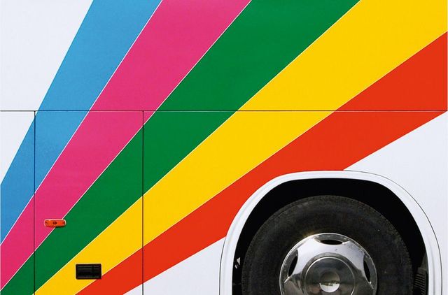Umso erstaunlicher ist es, dass der amerikanische Fotograf Taylor Holland an so vielen Reisebussen, die er in Europa an sich vorbeifahren sah, etwas Einzigartiges erkannt hat. Zum ersten Mal geschah es im März 2011 in Paris, als Taylor auf seinem Fahrrad den Eiffelturm passierte und plötzlich vor einem Reisebus in Regenbogenfarben stand. In der Nacht träumte er vom Regenbogen auf Rädern. Am nächsten Morgen, kaum mit dem Rad aus dem Haus, sah Holland in Paris auf einmal an jeder Ecke bunt lackierte Ferienbusse aus ganz Europa – und begann, sie zu fotografieren: Busse mit grünen Palmen auf gelbem Grund, Busse mit hellgrauen Möwen auf blauem Grund, Busse mit der glitzernden Skyline Frankfurts oder mit türkisfarbenen Pferden, Busse als fahrendes Bergmassiv-Panorama. »Ist das nicht faszinierend«, fragt Holland, »du fährst von München nach Rom – und auf der Autobahn überholt dich Die Erschaffung Adams von Michelangelo?«
