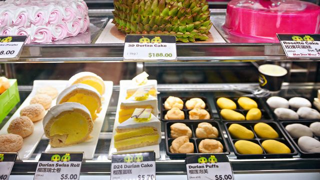Ich verweigere sein Eis. Ich probiere seine Streusel: dezenter Muff. Akzeptabel. Interessant. MJ Heng schneidet eine frische Mao Shan Wang auf. Man isst das Fleisch mit dem Löffel, mit einem Plastikhandschuh oder einfach aus der Hand. Ich nehme ein Stück und beiße ab. Die Durian hat die cremig-sahnige Textur einer überreifen, fast matschigen Avocado. Ich schmecke eine ausgewogene Balance von bitter und süß. Reizvoll. War es das? Bin ich bekehrt? Schon beim zweiten Versuch?