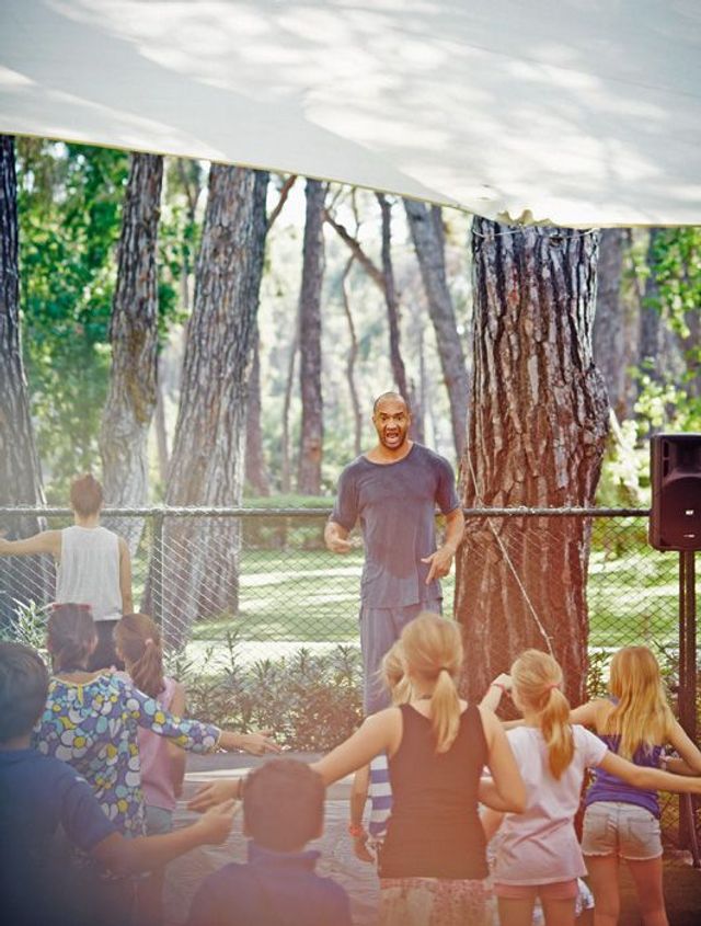 Die Kurse in Robinson Clubs gibt er seit sieben Jahren, Clubmanager Stefan Forster begrüßt ihn herzlich wie einen alten Bekannten. Auf einem großen Platz im Garten des Clubs präsentieren die Choreografen gerade ihr Programm: Kindern und Jugendlichen werden für 100 Euro extra zwei Trainingseinheiten täglich angeboten, jede dauert 90 Minuten. Erwachsene trainieren 75 Minuten am späten Nachmittag für 50 Euro.