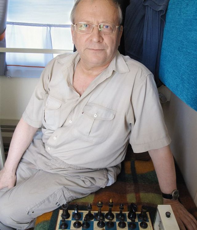 Jekaterinburg, Mitte sechzig. Er war auf einer Tagung in Nowosibirsk, hat etwas Wodka getrunken, spricht hervorragend Englisch, kennt Brecht und versucht, mit Maxima zu flirten, deswegen sitzt er auf meiner Liege in unserem Abteil. Sie zeigt ihm die kalte Schulter, weswegen er gern mit mir spielt, um in ihrer Nähe zu bleiben. Sergej holt sein eigenes Schachbrett und auch eine Uhr aus seinem Koffer. Sergej spielt eine mir eher unangenehme Eröffnung, sie heißt Nimzoindisch, und obwohl er betrunken ist und sein eigentliches Interesse Maxima gilt, schlägt er mich zweimal und verliert viermal nur knapp. Was für ein großartiges Spiel Schach sein kann und wie schnell die Tage doch vergangen wären in Gesellschaft von Sergej. Aber uns blieben nur drei Stunden, bis er aussteigen musste.