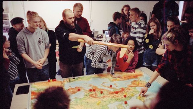 Als der letzte Franzose gefallen ist, gehen die Schüler zurück ins Gebäude, verschwitzt und gelöst wie nach einem Fußballspiel. »Wir wollten ein emotionales Erlebnis schaffen, damit sie sich gut an diese Woche erinnern können«, sagt Morten Tellefsen, einer der Lehrer. Sein Kollege Martin Hill steht ein paar Minuten später in einem der Unterrichtsräume vor einer schwierigeren Aufgabe: Er soll die verschwitzten Schüler nun motivieren, ihr Englisch und Deutsch zu verbessern und gleichzeitig etwas über Geografie und Geschichte zu lernen. Die Schüler klappen ihre Laptops auf und starren auf die Bildschirme. Einige fangen an, Call of Duty zu spielen, andere schauen sich Animes an. Martin Hill, der Lehrer, beugt sich einsam in der Mitte des Raumes über einen Tisch, auf dem er eine zwei Mal zwei Meter große Weltkarte ausgebreitet hat, und hofft, mit seinem Spiel die Aufmerksamkeit der Jugendlichen zu gewinnen.