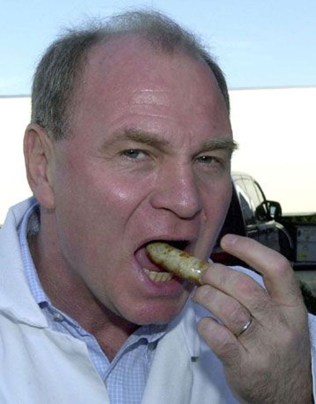 Hoeneß, den in Nürnberg alle nur »den Senior« nennen, ist, wie er sagt, kaum noch persönlich präsent in der Fabrik, höchstens drei- oder viermal im Jahr. Beim Mittagessen, vor einem Berg von Rostbratwürsten, als er gerade nach draußen zum Telefonieren gegangen ist, erzählt sein Sohn allerdings eine andere Geschichte. »Mein Vater zeichnet weiterhin jede Rechnung selbst ab. Außerdem ruft er ständig hier an und lässt sich die Bestellungen durchgeben, in der Hochphase im Sommer bestimmt zwanzig Mal am Tag.« Als Uli Hoeneß wieder zurückkommt und mit dieser Zahl konfrontiert wird, wiegelt er ab – nein, vielleicht fünf, sechs Mal, nicht mehr. Aber Florian Hoeneß nimmt sofort sein Handy aus der Jacketttasche und ruft die Sekretärin im Raum daneben an: »Frau Landkammer, wie oft meldet sich mein Vater bei Ihnen am Tag wegen der Bestellungen? – Schon, gell? Mindestens.« Lächelnd steckt er das Handy wieder ein.