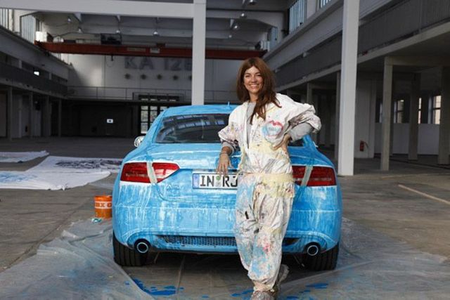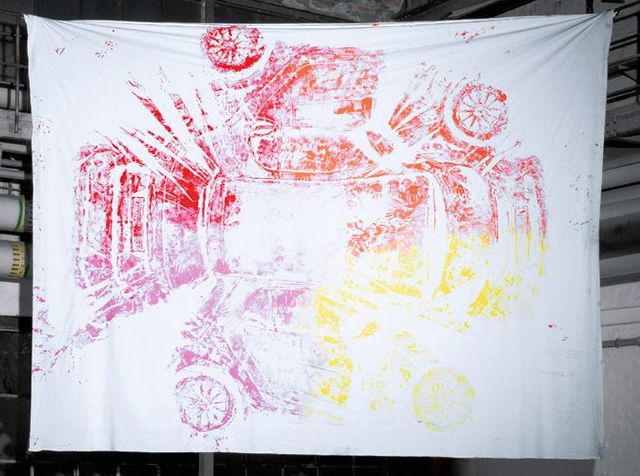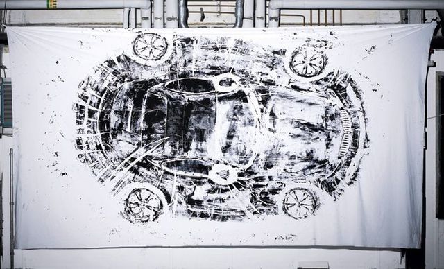 Wenn man den Stoff nach einer Weile abzieht, kommen Bilder heraus, die zeigen: So ein Tuch kann nicht nur die Form, sondern auch das Wesen der Autos enthüllen: Die blauen Spuren des Audi A5 Sportback auf dem weißen Hintergrund erinnern an den strahlenden Himmel über Ingolstadt, der BMW Z4 hinterlässt einen schicken und sehr coolen Eindruck. Der Mini Countryman wirkt modisch, der Smart bunt und jung. Linienführung, Dynamik, den ganzen Körper eines Autos, um den sich Designer immer so viele Gedanken machen, sieht man, wenn die Form so ausgebreitet vor einem liegt. Und ja, auch die Seele eines Autos.