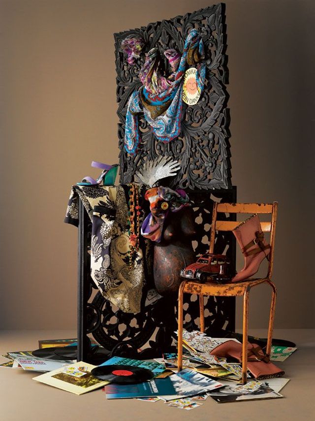Die Laute. Im Uhrzeigersinn: Sandaletten von Dries Van Noten; Tücher von Etro; Tuch an der Skulptur von Codello; Duft »Secret Obsession« von Calvin Klein; Stiefeletten und Ketten von Louis Vuitton; Mantel von Etro.
