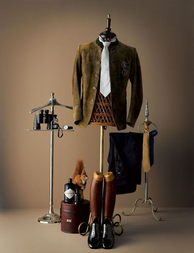 Der General. Im Uhrzeigersinn: Janker von Meindl; helle Krawatte von Giorgio Armani; Brille von Lindberg, beige und blaue Krawatte von Prada; Anzug von Giorgio Armani; Schuhe von Prada; Duft »Boss.Bottled« Uhr von Baume und Mercier; auf stummem Diener: Duft »Aventus« von Creed. Auf der Hutschachtel: Hendrick’s Gin. Auflösung: Ursula von der Leyen (1), Dr. Karl Lauterbach (2), Sahra Wagenknecht (3), Guido Westerwelle (4), Claudia Roth und Karl Theodor zu Guttenberg (5)