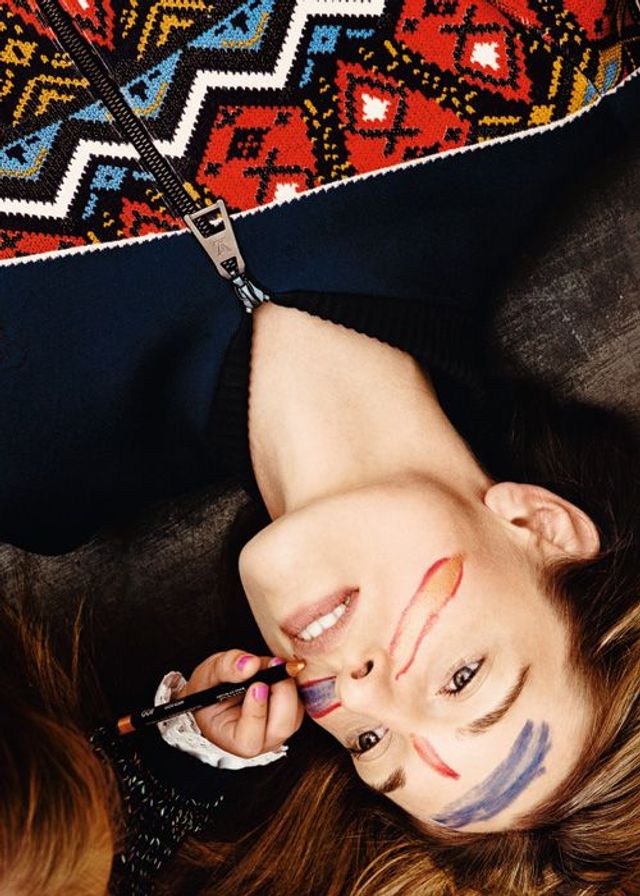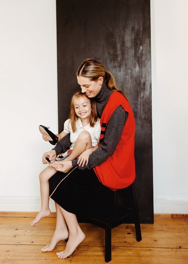 Häkelpullover von Bellerose, Rock von Lacoste, Ballerinas von Repetto; Nagellack von Chanel.