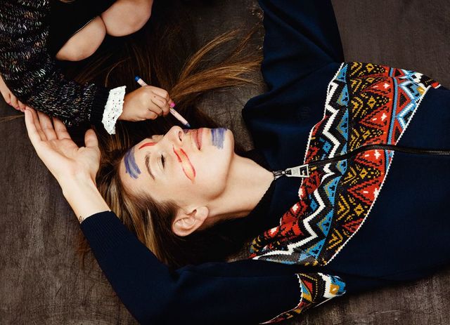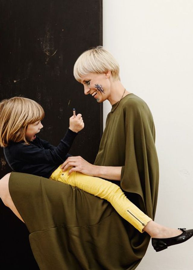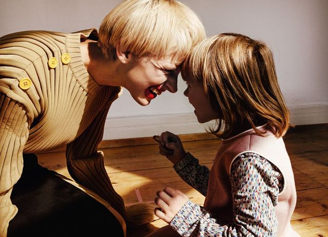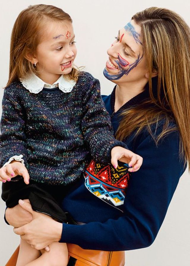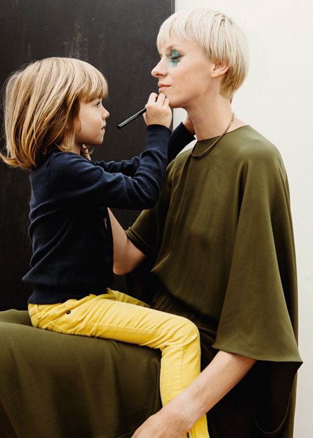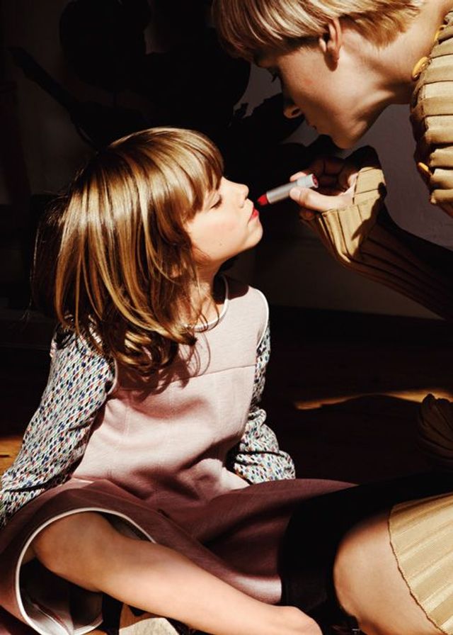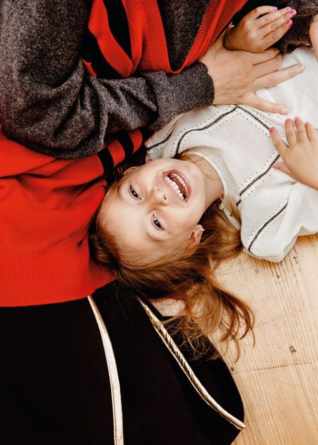 Nico: XL-Ripp-Pullover von Céline; Lippenstift »Rouge in Love« von Lancôme. Lore: Kleid von Simonetta; Longsleeve von Kids Case.