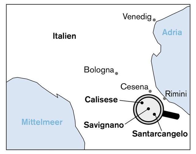 »Pah«, sagt Rino Zoffoli aus Calisese, 2100 Einwohner, rund zehn Kilometer nordwestlich. »Rubikon heißt der Fluss von denen doch nur, weil Mussolini das 1933 per Dekret so entschieden hat!« Der ehemalige Lehrer Zoffoli ist fest der Auffassung, der örtliche Bach namens Pisciatello sei der historische Rubikon. Kichernd sitzt der 75-Jährige in einer Bar neben der Kirche von Calisese, die wiederum nicht weit von einer winzigen Brücke liegt, die über einen winzigen Bach führt. Hübsch anzusehen, aber ein Rinnsal.