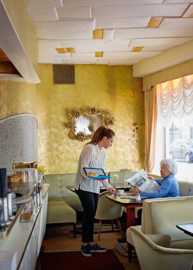 Sabrina Haja, »Café Jasmin« »Mir gefällt die aufklappbare Tastatur in Blau, die man an das Tablet anstecken kann. Da kann man leichte Dinge wie ein Croissant drauflegen, aber das Ganze trotzdem noch in einer Hand halten. Denn eine Sache würde eine professionelle Bedienung nie tun: Das Tablett auf dem Tisch der Gäste abstellen. Wer das macht, entlarvt sich gleich als Aushilfsjobber. Bedienen hat mit Kontrolle zu tun - und die gibt man nicht aus der Hand. Wobei man eigentlich gar nicht ›bedienen‹ sagt, sondern ›einsetzen‹, das habe ich bei meiner Ausbildung in einem Fünf-Sterne-Hotel gelernt. Und statt ›abräumen‹ sagen Profi-Kellner ›ausheben‹. Warum, weiß ich aber auch nicht so genau.« Das Microsoft Surface ist fast schon ein Laptop - mit eingebauter Aufstellstütze und Tastatur lässt es sich bedienen wie ein Computer (ab 480 Euro).