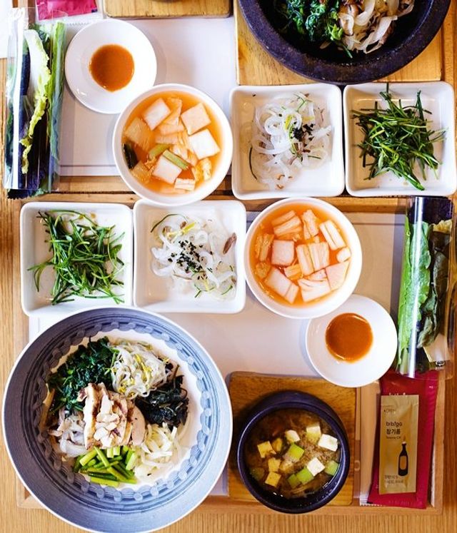 Fisch, Rind, Huhn oder ein Spiegelei können dazugehören, vor allem aber Gemüse: Kürbis, Ginsengwurzel, Asiatische Petersilie, frittierter Seetang, Teotukwurzel (die wächst nur in Korea), Sesamblätter, Seerosenwurzel, Sojabohnensprossen, Peperoni, Pilze, Kimchi, also eingelegter Rettich, Gurke oder Glockenblumenwurzel, zwei Jahre lang in Peperonipaste gegoren, erst dann wird Kimchi besonders gut. Bibimbap ist ein Resteessen – Gwyneth Paltrow etwa kocht eine entschärfte, Filmwelt-kompatible Version mit wenig Knoblauch, Kimchi und Peperonipaste und viel braunem Reis, Karotten, Pilzen und Lauch. Wirklich alle Zutaten sind erlaubt, solange man die Harmonie der Farben berücksichtigt: Ausgeglichen wirkt Bibimbap nur, wenn die fünf Farben Gelb, Grün, Blau, Rot und Schwarz in den verschiedenen Beilagen berücksichtigt sind.