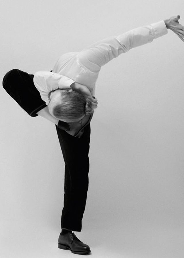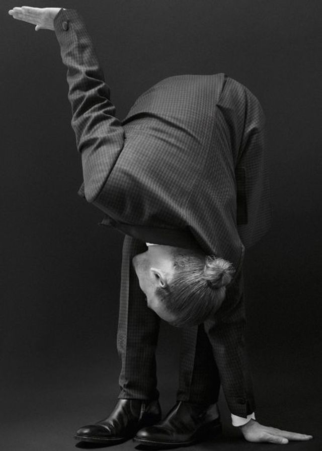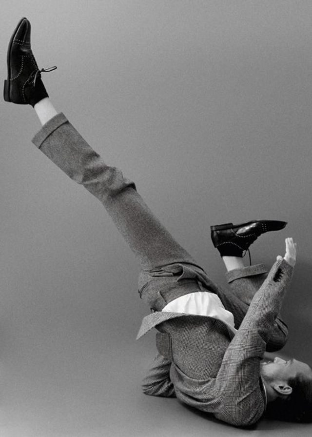 Karierter dunkelgrauer Anzug von Canali. Weißes Hemd aus Baumwolle, von Lemaire. Schwarze Stiefeletten von Jil Sander.