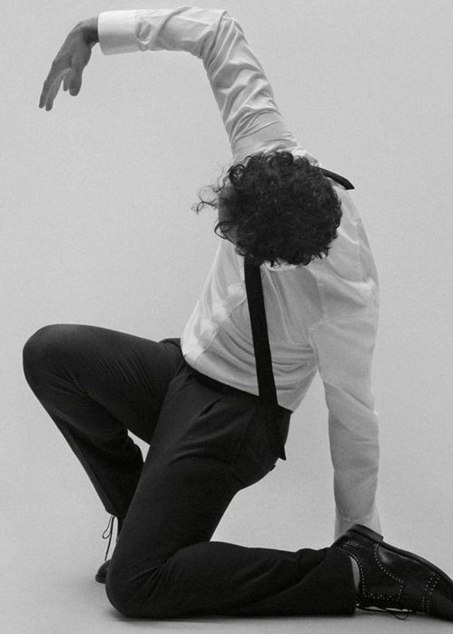 Weißes Hemd, schmale Krawatte und Hose mit Ziernaht, alles von Dolce & Gabbana. Schwarze Lederschuhe von Ludwig Reiter.