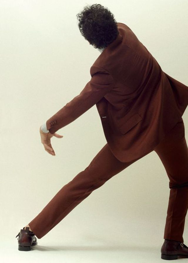 Bordeauxfarbener Anzug von Brioni. Rollkragenpullover aus Kaschmir, von Canali. Braune Lederschuhe von Salvatore Ferragamo.