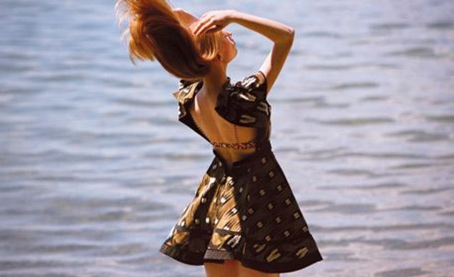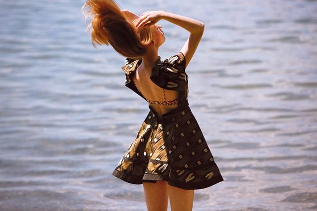 Noch einmal die Haare vom Seewind zerwühlen lassen, bevor es dunkel wird und den Gänsen nur noch ein paar Tage bis Weihnachten bleiben. Kleid von Louis Vuitton; Bikinioberteil von Versace.