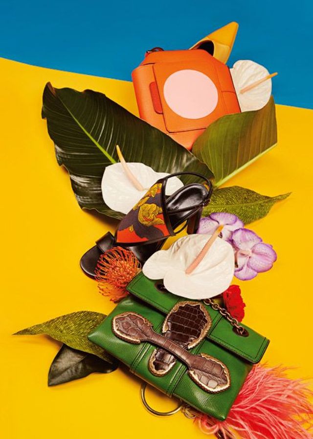 Pumps von Fendi, Tasche (mit Fransen) von Giorgio Armani, flache Sandale (mit Federn) von Prada, cremefarbene Tasche von Tod’s, großer einzelner Ohrring von Chanel, kleine Ohrringe von Susa Beck.