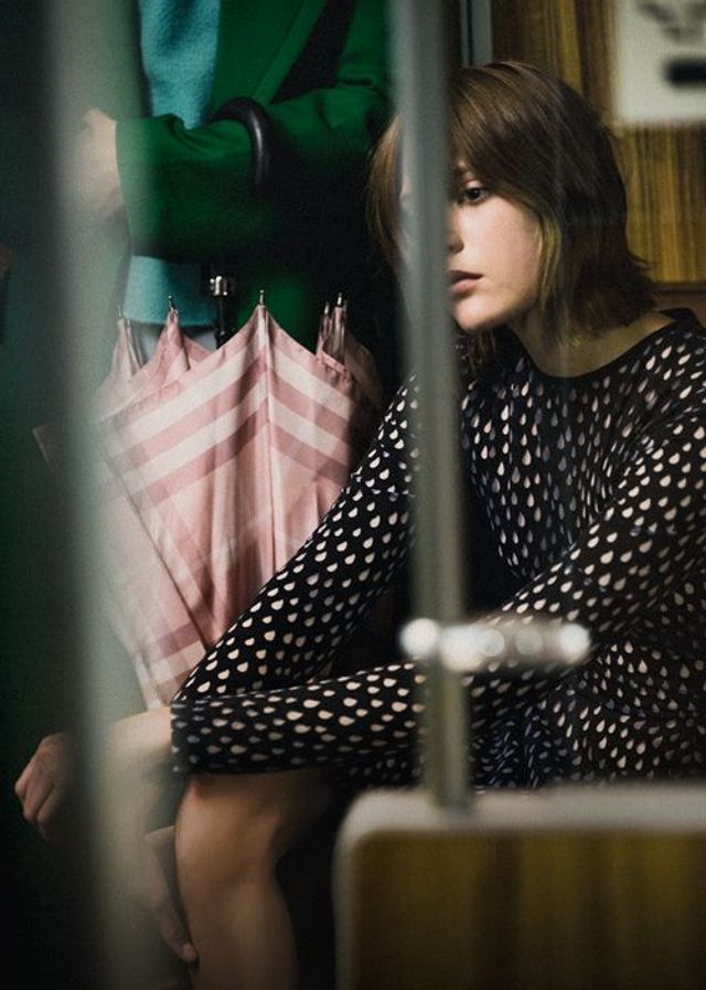 Türkisfarbener Pullover von Giorgio Armani; Mantel von Jil Sander; rosafarbener Regenschirm von Burberry; Kleid mit Regentropfen, von Stine Goya.