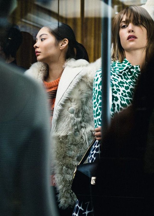MAGISCH VONEINANDER ANGEZOGEN: Kunstfelljacke von Tommy Hilfiger Collection; orangefarbener Strickpullover von Miu Miu; Leopardenbluse und Rock, beides von Miu Miu; Handtasche von Longchamp.