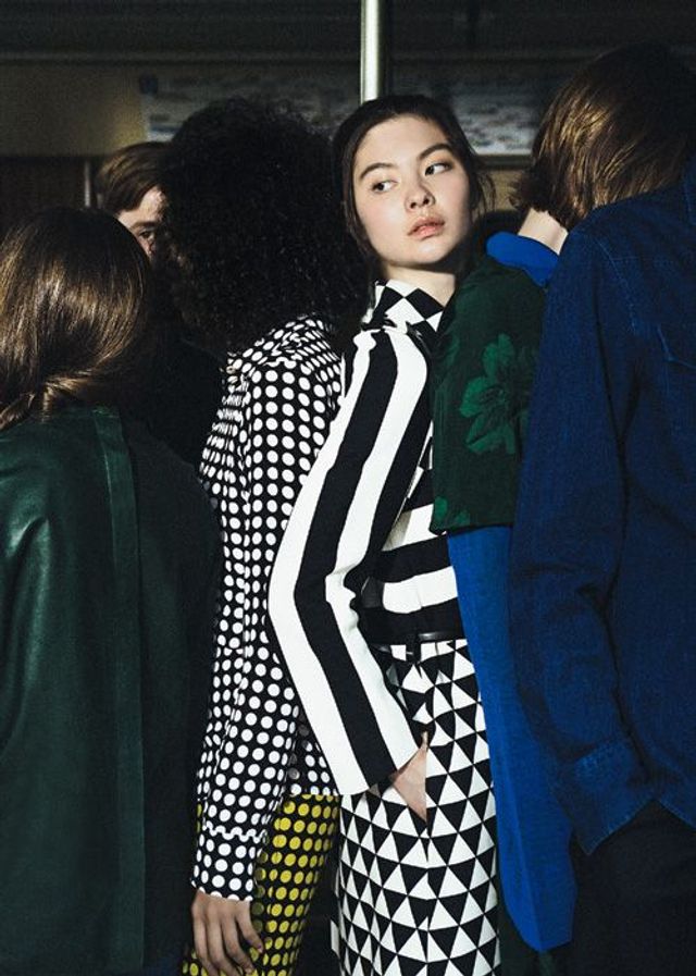 Grünes Ledertop von Salvatore Ferragamo. Gepunktete Bluse und Hose, beides von Bottega Veneta; schwarzweiß gemusterter Mantel von Valentino; Kurzarmpullover und Seidenkleid, beides von Stella McCartney; Jeanshemd von Bottega Veneta.