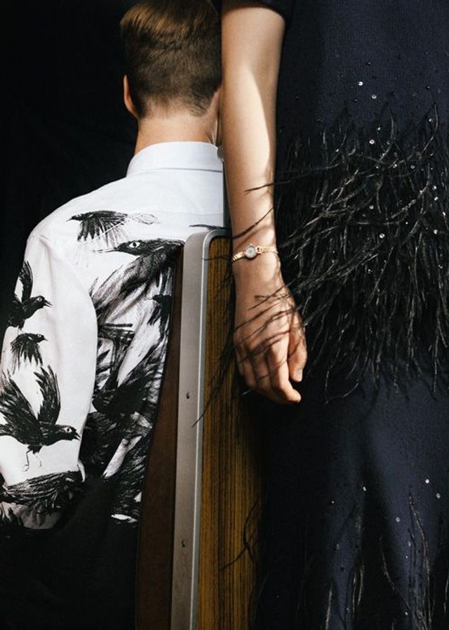 Hemd mit Vogelprint,von Dsquared über stylebop.com; Federrock und Pullover, beides von Michael Kors; roségoldene Uhr von Hermès.