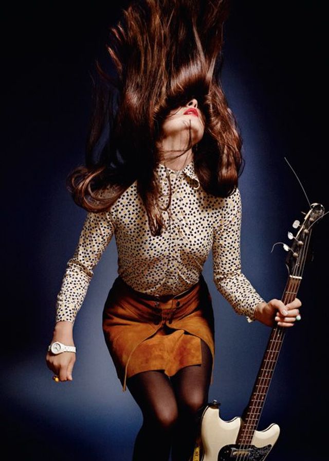 Polly, E-Bass Polly ist Rock'n'Roll und Disco in einer Person. Mit ihrer Zwei-Mann-Band Pollyester steht sie in den Münchner Kammerspielen auf der Bühne genauso wie bei ihrer eigenen Partyreihe »Zombocombo« - einer Mischung aus Vampirparty mit bizarren Verkleidungen und wilder Clubnacht. Im nächsten Jahr soll ihr zweites Album beim Münchner Label Permanent Vacation erscheinen. Polly trägt eine weiße »Hyperchrome Automatic« von Rado. Die Ringe sind von Sarah Lierl, sarahlierl.de