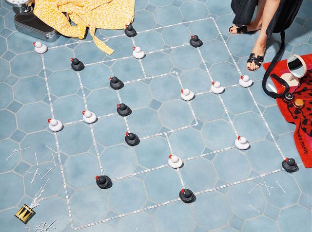 Zementsteinfliesen mit Einlegern, von Popham Design; Personenwaage »Wunder« über Material & Konzept; gelber Kinderbademantel von Abyss über Bäder Obermaier, München; Badeenten »Babsi« (schwarz) und »Katja« (weiß) über duckshop.de; Sandalen »Oran« von Hermès, Nagellack »Beautiful Liar« von Estée Lauder; schwarzer Bademantel von Versace; Handtuch »Félin« von Hermès; Schminkspiegel »Beauty« von Schönbuch; Maskentopf (schwarz) Anti-Aging-Peeling »Youthmud« und Maskentopf (orange) Brightening Treatment »Flashmud« von Glam Glow; kleine Trommel von Porzellanmanufaktur Nymphenburg.