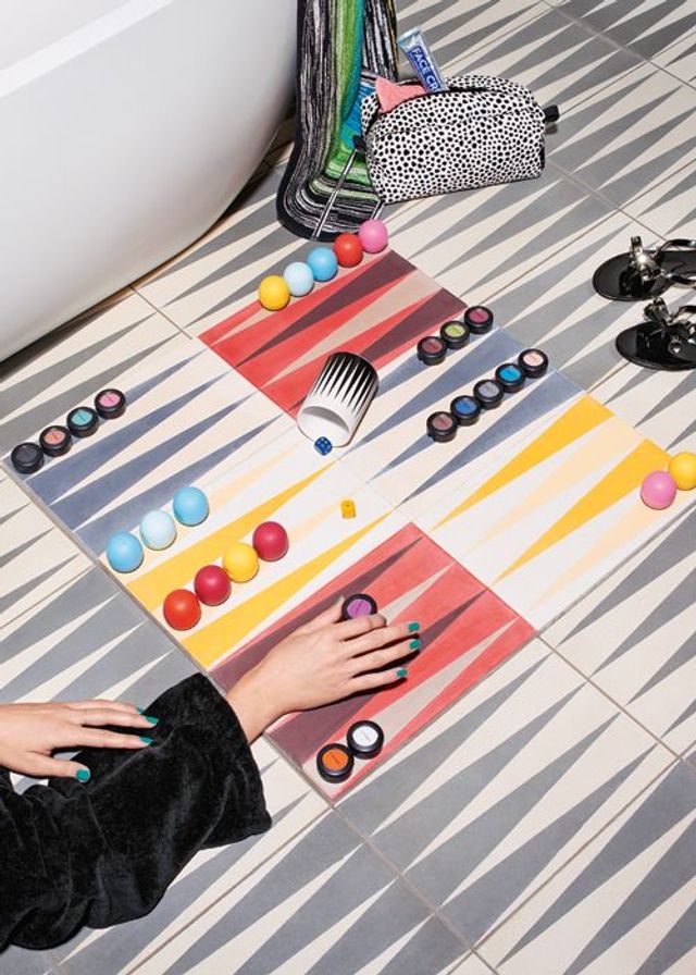 Zementfliesen »Backgammon« von Popham Design; Wanne »Naiade« über Material & Konzept; schwarzer Bademantel von Versace; grüner Nagellack »Hope« von Kure Bazaar; Lippenbalsam im Kugelbehälter, von Eos; Lidschatten von M.A.C; Becher »Geometry 1« von Ferm Living; Handtuch von Missoni Home; Kulturbeutel »Dot« von Hay; Flipflops von Valentino.