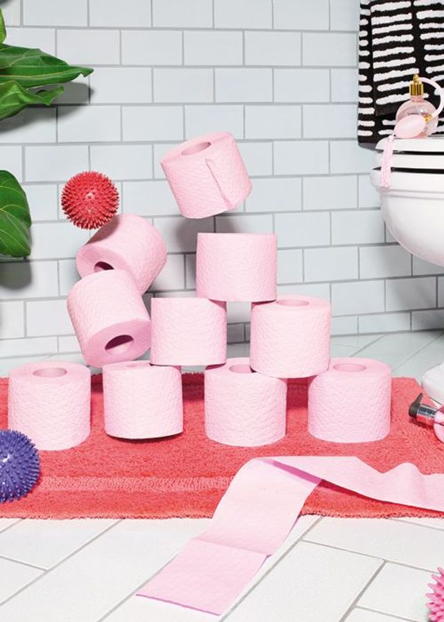 Glasierte Wandfliesen »Soho« und glasierte Lavasteinfliesen »Panorama« (Boden), beide über Material & Konzept; roter Badvorleger von Abyss über Bäder Obermaier, München; Massagebälle von Hansson Sport; Toilettenpapier von Hakle; Hand Wash »Rhubarb & Rose« von Molton Brown; Stand-WC »Brescia« über Material & Konzept; Raumspray »Musk« mit Zerstäuber, von Sabon; Handtuch »He, she, it« von Nathalie Du Pasquier für Hay.