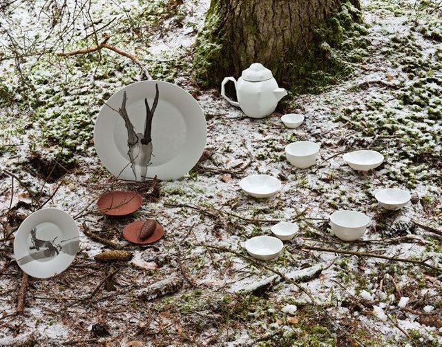 Zart wie eine leichte Schneedecke auf dem Waldboden: Brotteller und Speiseteller »Piqueur« von Stefanie Hering, Hering Berlin; Schälchen, Untertasse und Tannenzapfen aus braunem Böttgersteinzeug, Meissen; Teekanne und Schalen »Lightscape« von Ruth Gurvich, Nymphenburg.