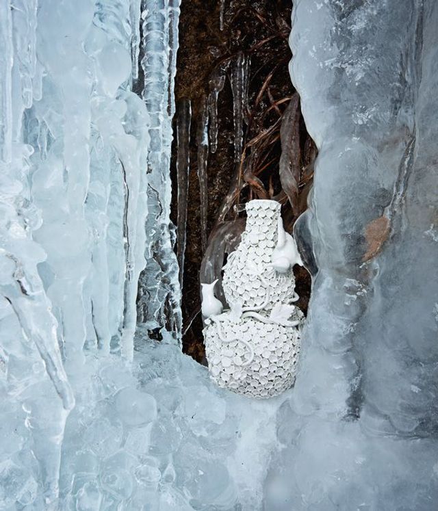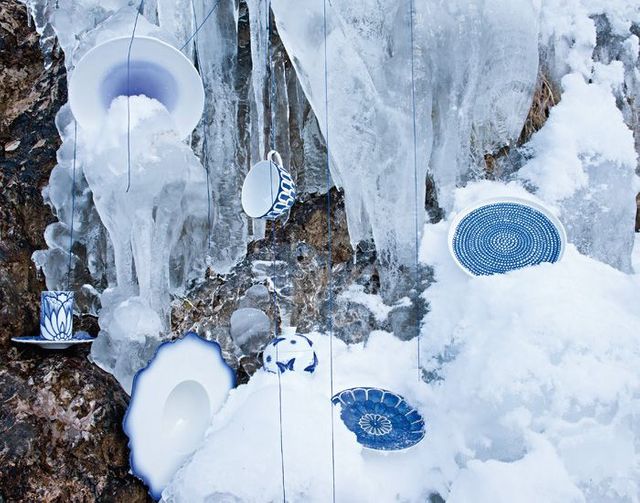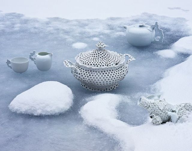 Filigrane Strukturen auf der Eisfläche eines zugefrorenen Sees: Tasse, Milchkännchen und Kombikanne »Landscape« von Patricia Urquiola, Rosenthal; Terrine »Sito« von Alim Pasht-Han für Anthologie Quartett.